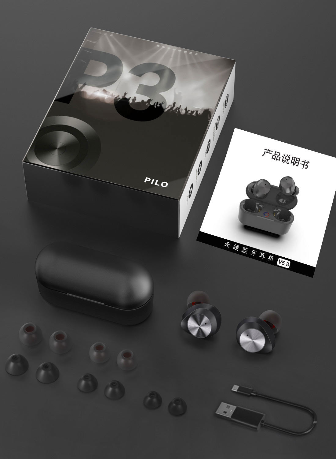 Full set of standard equipment: Host x1 pair, charging bin 1, usb cable x1, instruction x1, ear cap 5 pairs, packaging x1